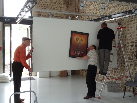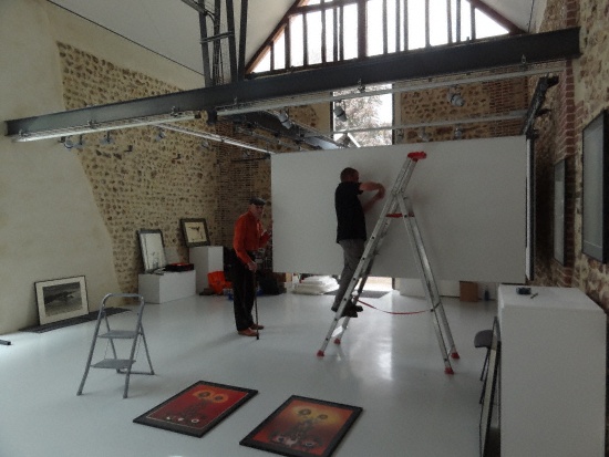 Installation de l'exposition à l'Espace Culturel des Tanneries de La Ferrière-sur-risle, Barlach Heuer et Johnny en plein travail.