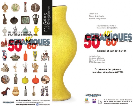 Du 26 Juin au 3 Novembre 2013, le Musée de la Faïence de Sarreguemines accueillera l'exposition " Céramiques 40 50 60 " collection privée de Madame Bénédicte Wattel et de Monsieur Jean-Jacques Wattel.