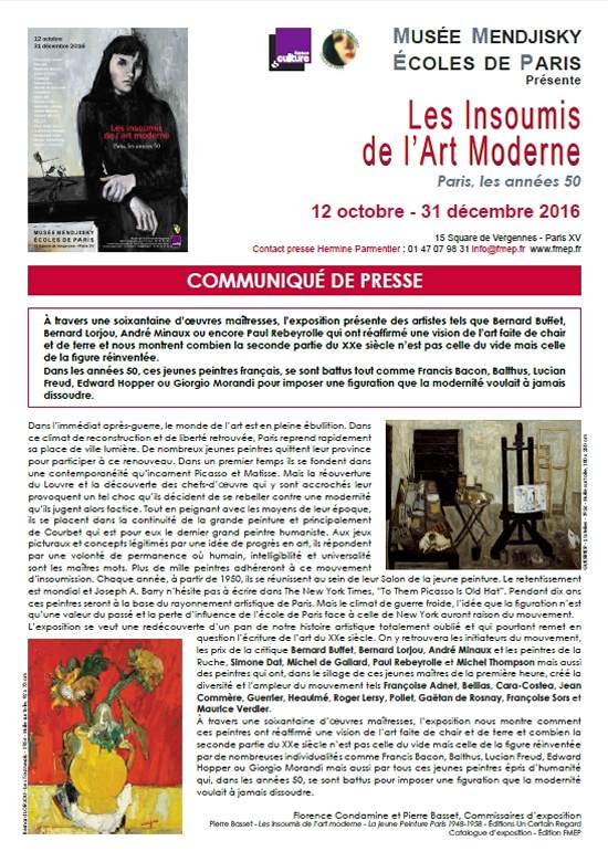Visuel Plaquette Communiqué de Presse Exposition " Les Insoumis de l'Art Moderne, Paris les Années 50 " - Musée Mendjisky 2016