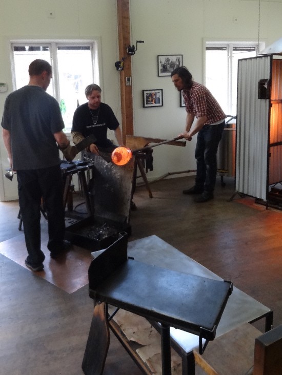Peter Hermansson et son ami Micke Johansson, maître verrier, réalisant un vase, assisté par un compagnon de poste.