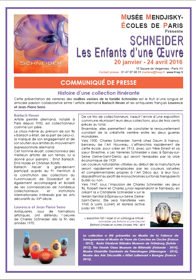Communiqué de Presse Officiel " Schneider les Enfants d'une Oeuvre" - Musée Mendjisky - Ecoles de Paris (France) 2016