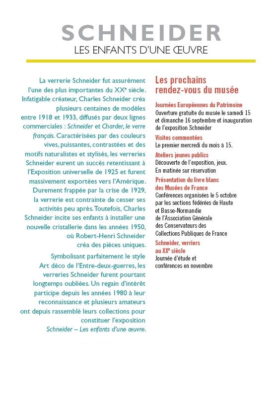15 Septembre - 2 Décembre 2012 : " Exposition Schneider les Enfants d'une Oeuvre " au Musée du verre de Conches en Ouche (France).