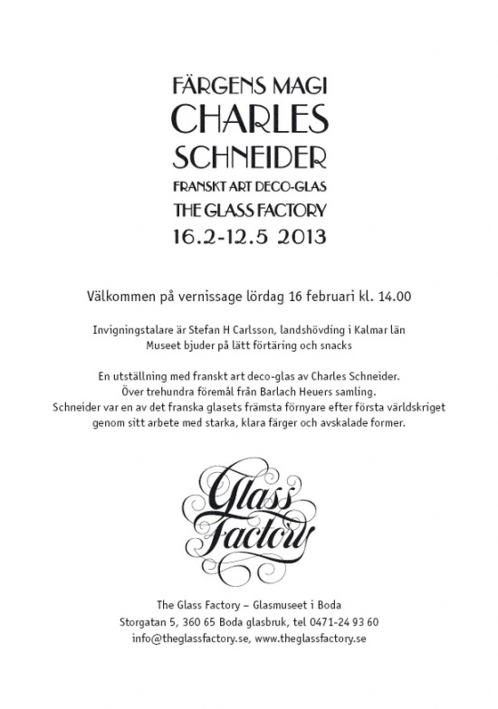 16 Février - 12 Mai 2013 : Exposition " Schneider The Celebration of Glass Färgens Magi Charles Schneider Franskt Art Deco-Glas " au Musée The Glass Factory de Boda Glasbruk (Suède)